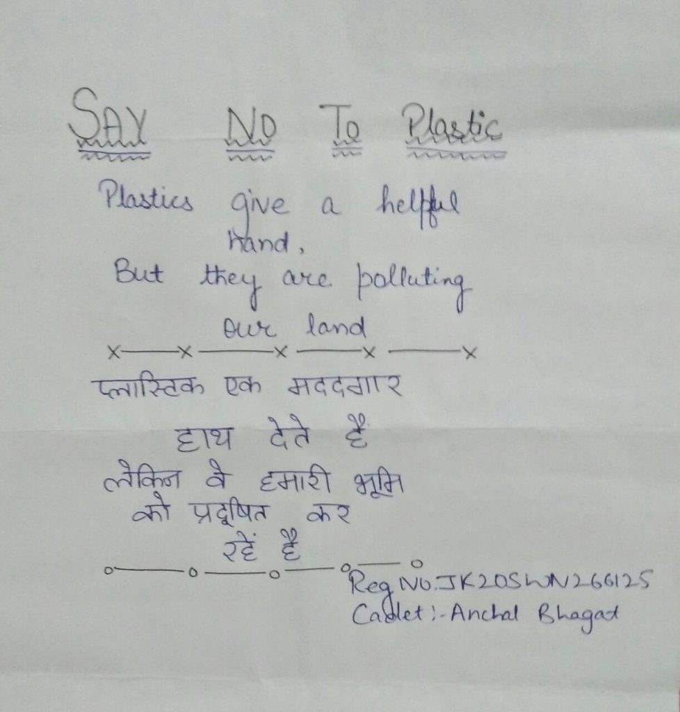 Cadet Tanishqa Channawar Article on" No Plastic Bag Day" Jai Hind