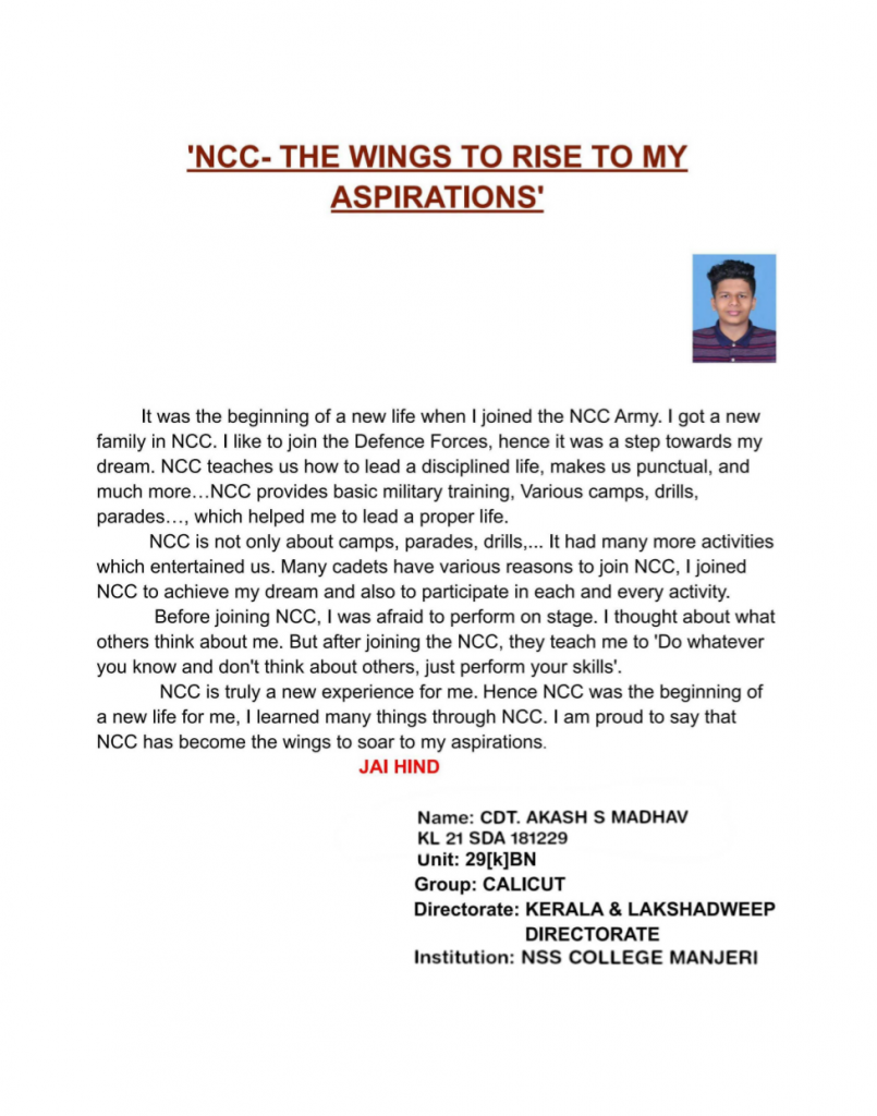Cdt. AKASH S MADHAV, KL 21 SDA 181229, NSS COLLEGE MANJERI.