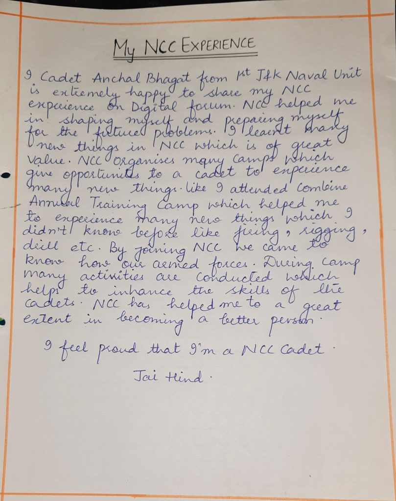 JK20SWN266125 Cadet Anchal Bhagat My NCC Experience