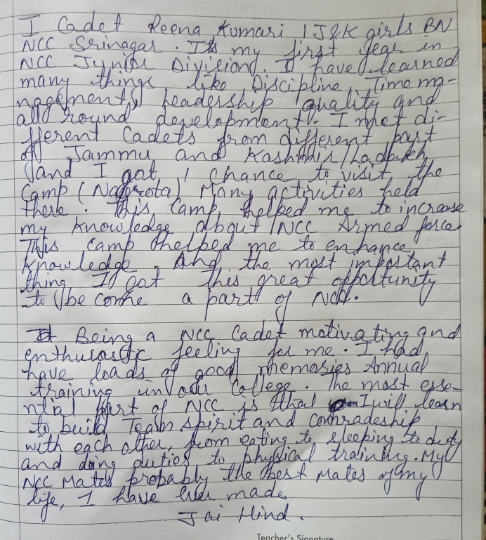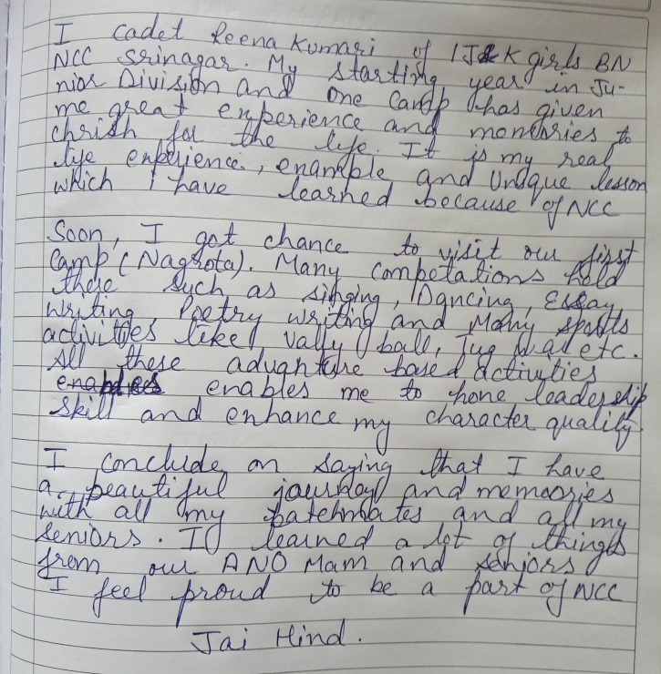 I cadet Reena Kumari 1&K Girls BN NCC Srinagar from GCW Gandhi nagar Jammu. I'm here to share my experience in NCC.