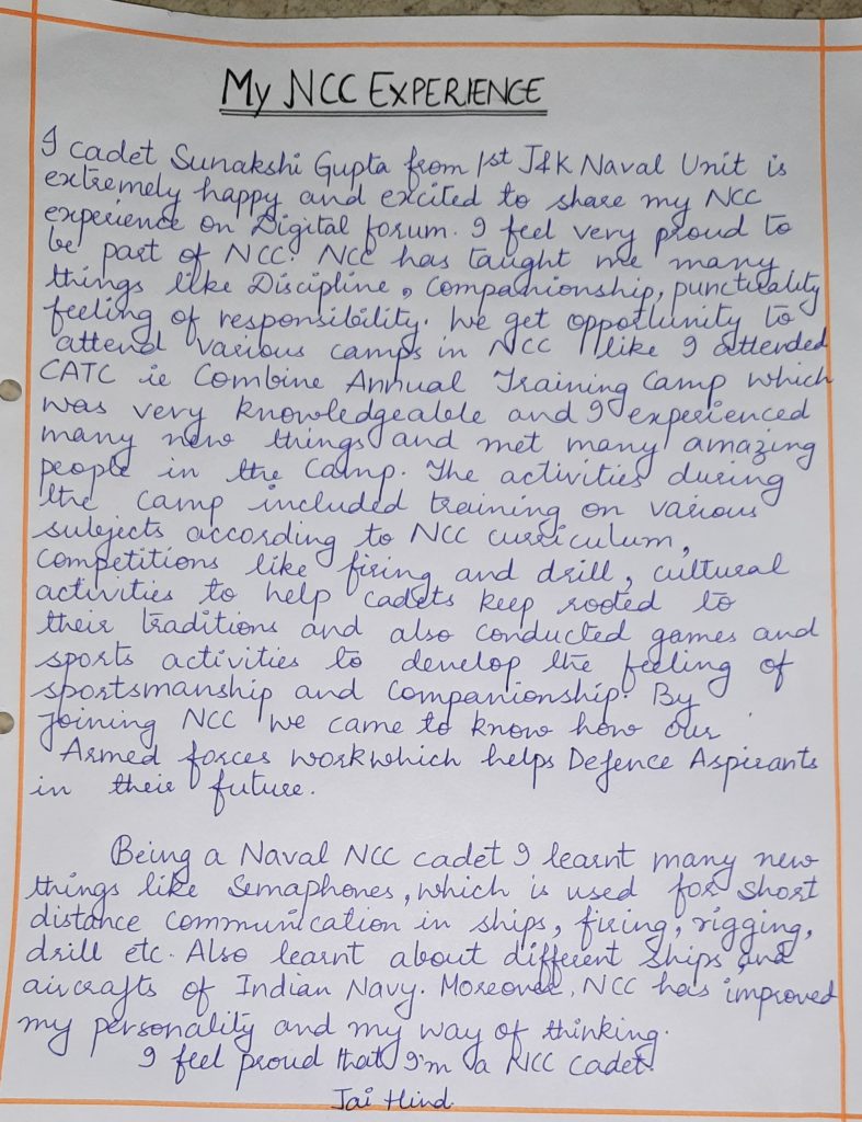 JK20SWN266121 Cadet Sunakshi Gupta My NCC Experience