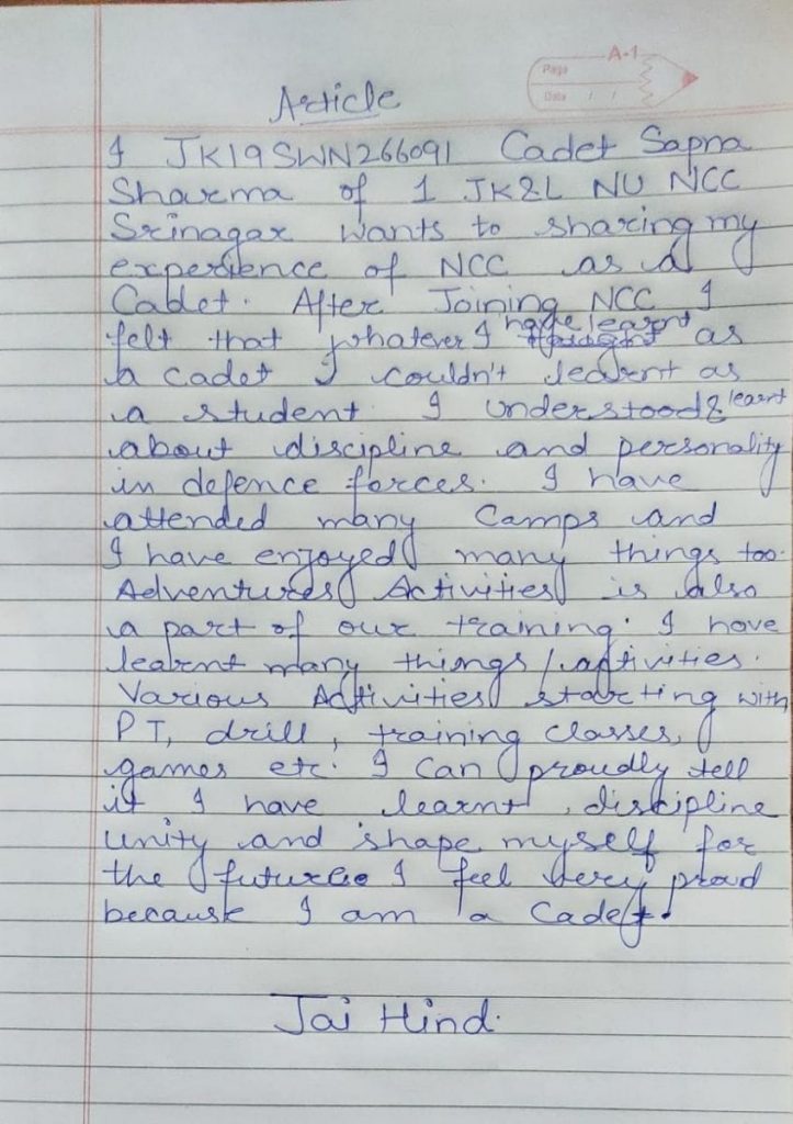 HELLO EVERYONE, MY SELF MOHD SALMAN OF JAMMU AND KASHMIR 1st. NAVAL UNIT FROM SAINIK SCHOOL NAGROTA CADET NO:-JK20JDN990573