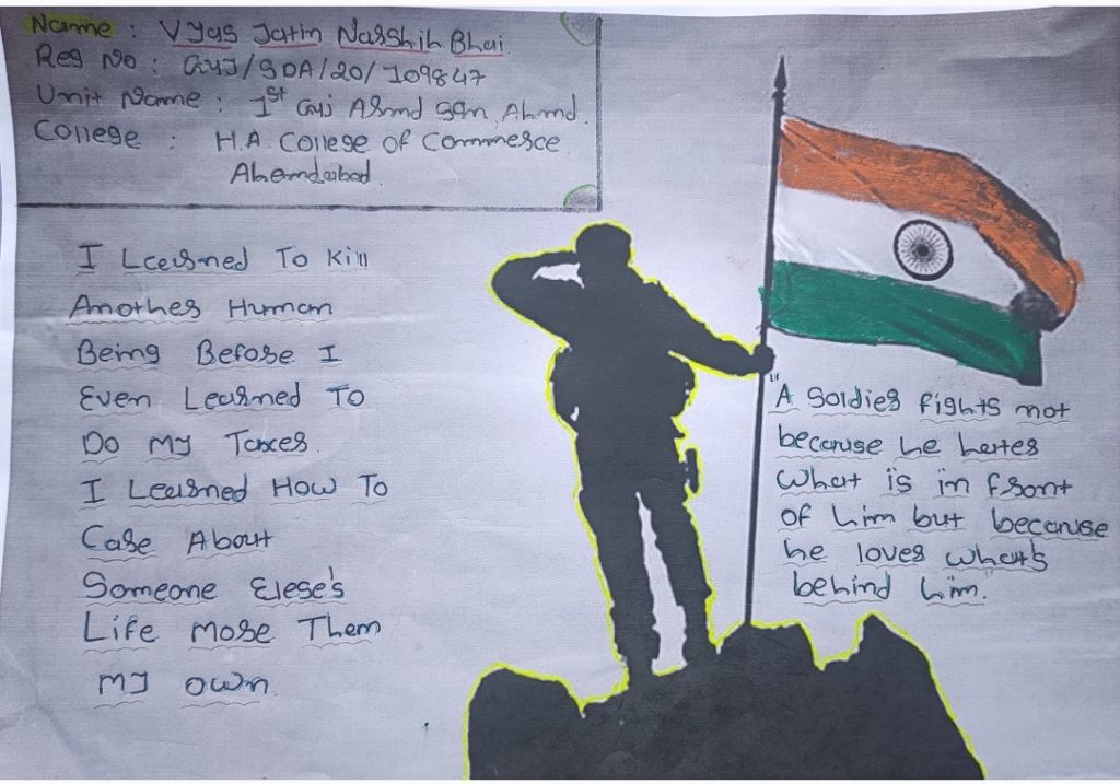 I am vyas jatin Narshinh bhai student of H.A College of commerce ncc cendet 1st Guj Armd Sqn , Ahmedabad,Reg no, GUJ/SDA/20/109847