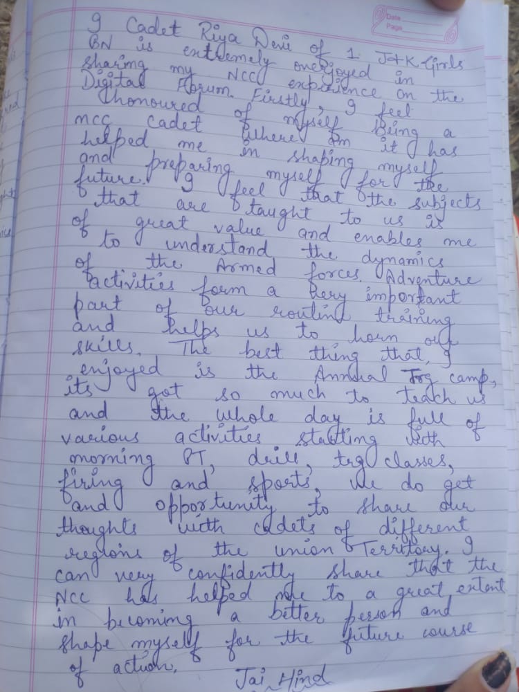 I Cadet Riya Devi with regno. JK20SWA/187052 shares my experience of NCC