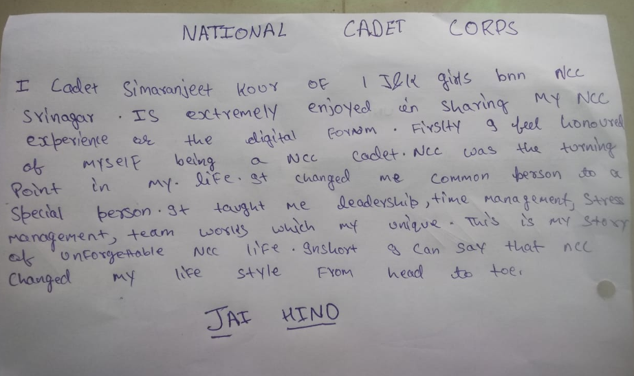 I cadet simaranjeet kour from gcw Gandhinagar 1 j&k girls bnn NCC Srinagar . Here to represent my article on the experiences in my NCC life from 2020