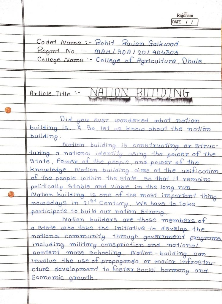 Cadet Name :- Rohit Rajan Gaikwad Regmt. No. :- MAH/SDA/20/404303 College Name :- College Of Agriculture, Dhule