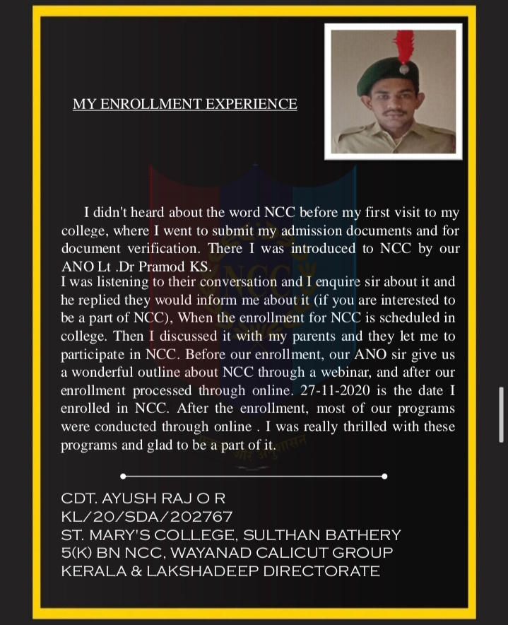 CDT Anagha Sudheer KL/20/SWA/202783 St. Mary's College NCC unit 5(K) Bn NCC Wayanad Calicut group Kerala &Lakshadweep Directorate