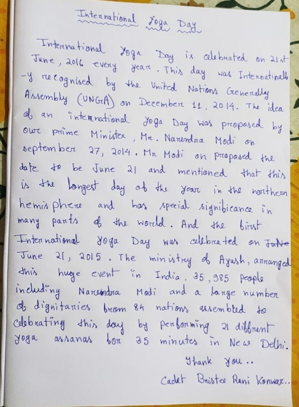 My self cadet Bristee Rani Konwar from Dibrugarh Hanumanbox Surajmal Kanoi college 10 Assam Battalion.. I want to say that The nature of yoga is to shine the light of awareness into the darkest corners of the body.” — ...
