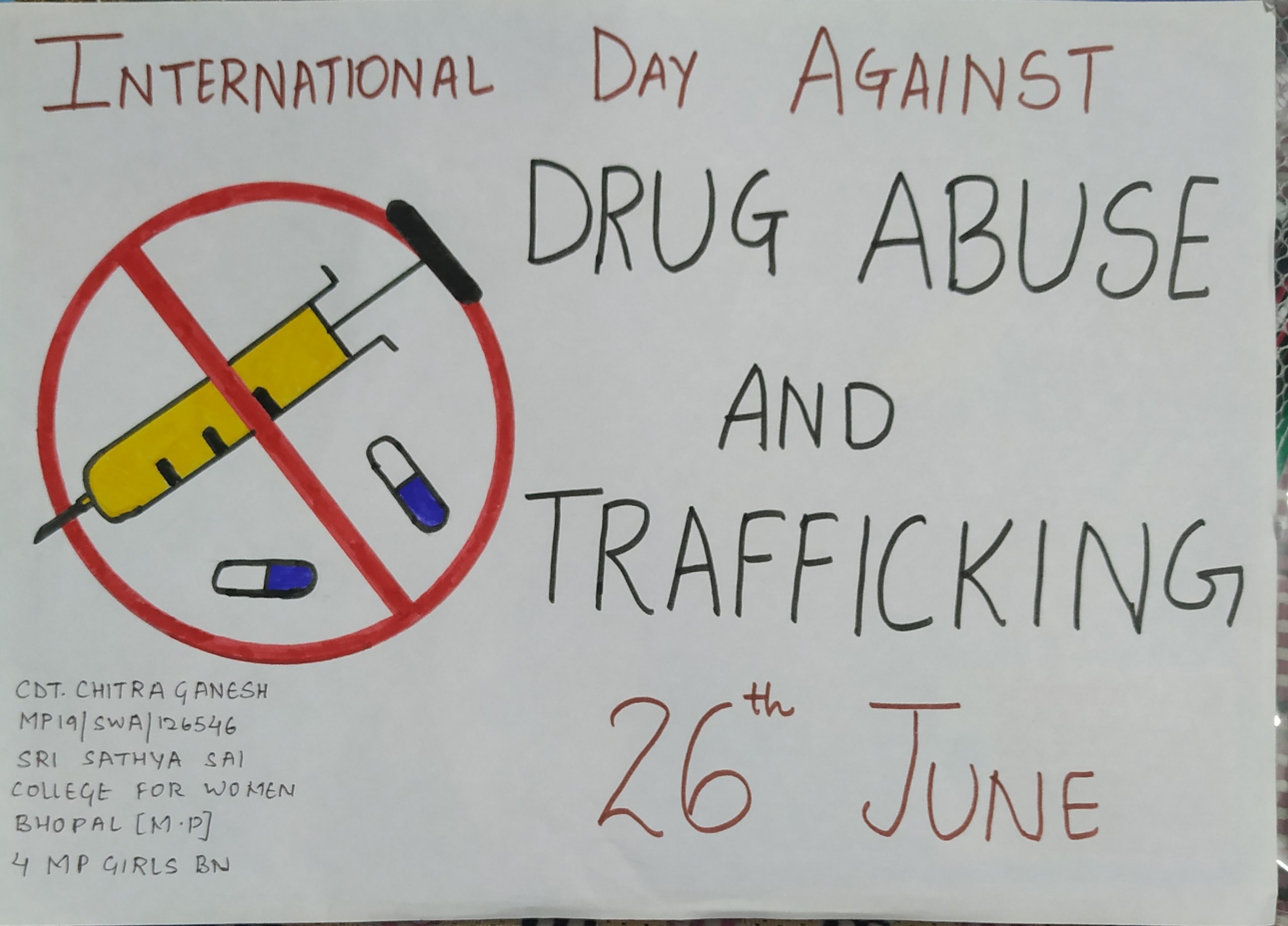 Jai hind. I am Cdt. Chitra Ganesh of Sri Sathya Sai college for women bhopal grp had made poster on International Day against Drug and illicit trafficking....