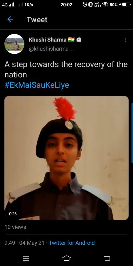 I am Cdt Cpl Khushi Sharma from 1 GUJ AIR SQN NCC, BARODA. This is my contribution towards the campaign #EkMaiSauKeLiye initiated by GUJ Dte.