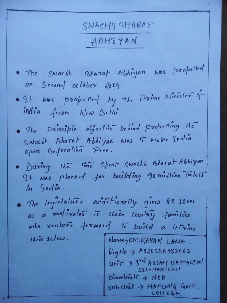 I'm cadet Karan Lama Reg no- A20SDA132062 Unit-3 Assam Battalion Silchar Directorate- NER College- Haflong Govt College Article - swachh Bharat Abhiyan