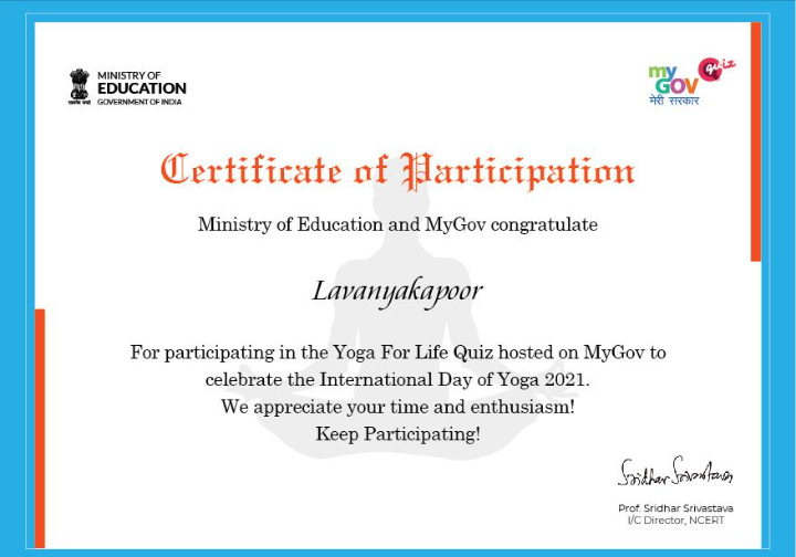 I am cadet-lavanya kapoor from 8 PB BN NCC PHAGWARA is here to share my e certificate on completion of yoga day quiz.