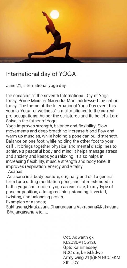 I am Nandana GS from 4 Kerala Battalion NCC, Neyyattinkara. It is very happy to observe International Yoga Day. Yoga is essentially a practice for our body and mind..