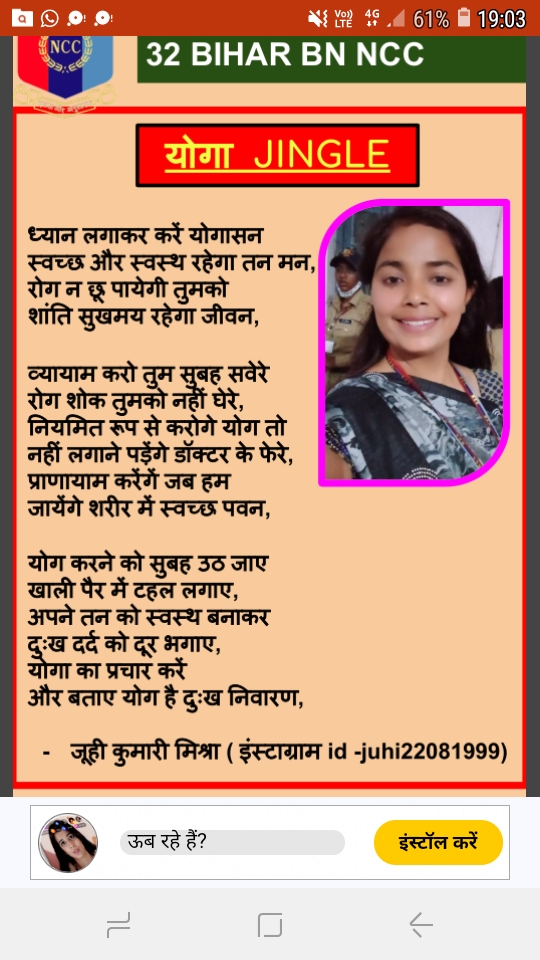 Hi am Cadet Sulaghna Dey under 2 Bengal Girl's Battelion NCC Kol B West Bengal & Sikkim from Serampore Girl's College Here is the video of yoga for International Yoga Day..