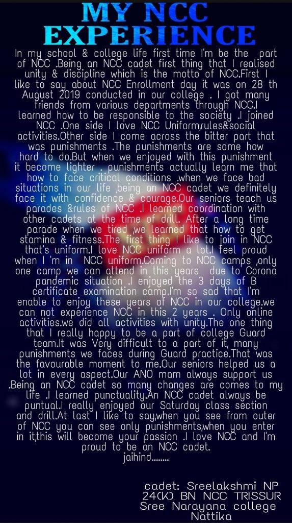 My self cadet Sreelakshmi NP 24 (K) BN NCC TRISSUR.Sree narayana college Nattika, Trissur. Here I share my experience in NCC .