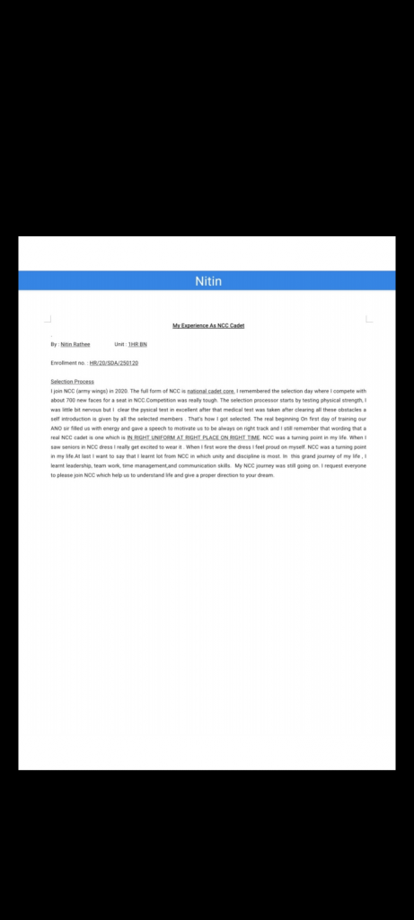 Name- Cdt.Sachin Sakti Ranjan Regimental no.- OD/19/SD/N/835963 Unit- 4(O) Naval Unit