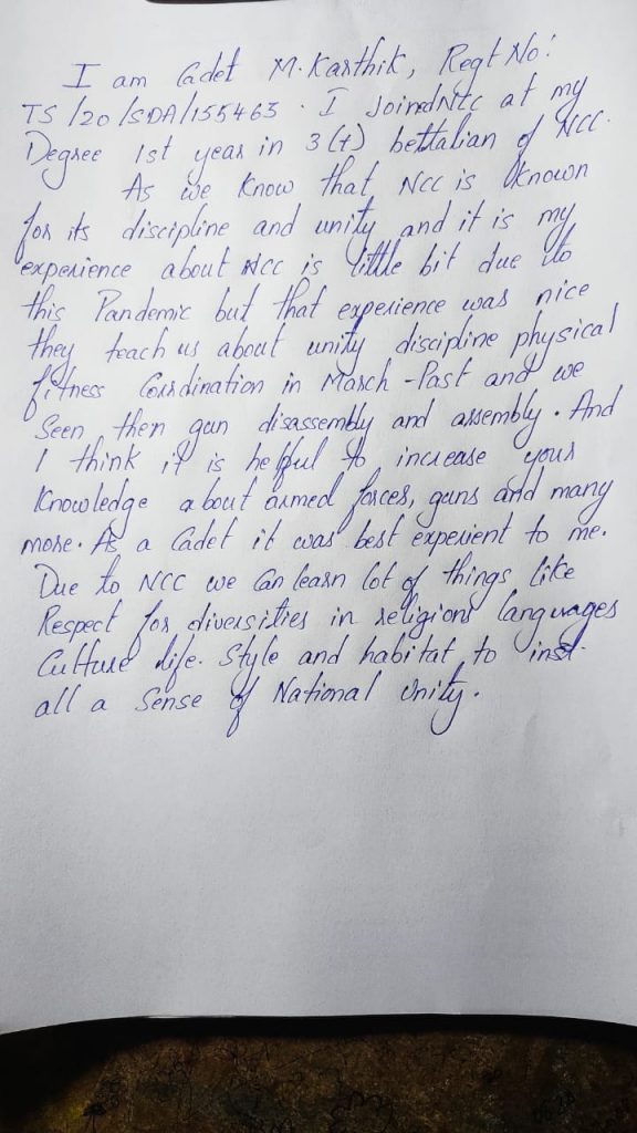 Name:m.karthik Regimental no: TS/20/SDA/155463 College:Aurora Degree and Pg college compancy:17/3 Battalion:3 (T)BN NCC An/T