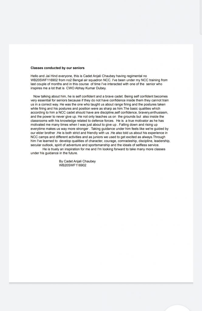 Name - Priyanka Gorain Reg. number - WB20SWA198688 Rank - CDT Unit name - 51 Bengal BN NCC, Purulia College Name - Jhalda A.M College