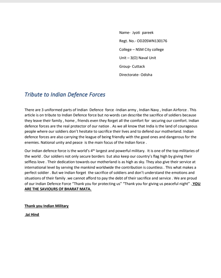 Myself Cadet Jyoti pareek from NSM city College 3(O)Naval unit . This article is a tribute to our Indian soldiers for their selfless love for our motherland.