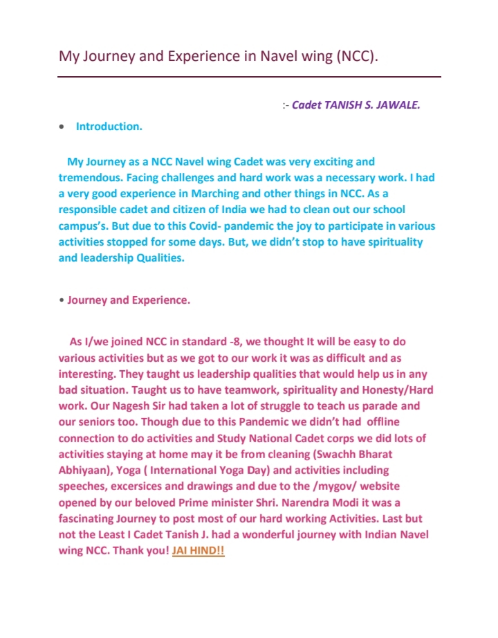 Name : Cdt Subhalaxmi Shree Regiment no. :OD20SWN130015 Institution : Ravenshaw university Unit: 3(O) Naval unit Cuttack headquarter Odisha Directorate