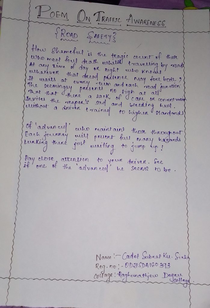 Name:- CDT Subrat Kumar Sinha; Reg.no.:- OD21SDA160393; Unit:- 1(O) ARMD SQN NCC, CUTTACK; COLLEGE:- RAGHUNATHJEW DEGREE COLLEGE.