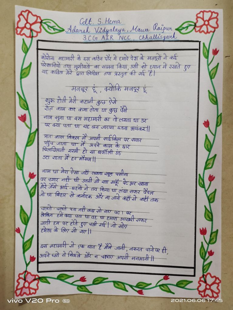 I AM CADET S. HEMA. FROM ADARSH VIDYALAYA MOWA UNIT 3 CG AIR NCC ENROLLMENT NO. CG/20/JW/F/685856