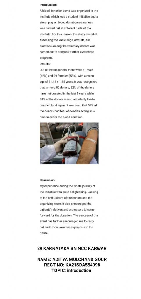 I am Aditya Gaur I joined NCC when I was in 8th standard, NCC has given me so much positiveness, discipline patients and patriotism the above details are about the introduction.