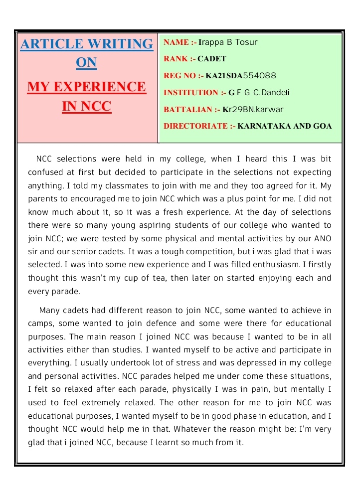 Name: Irappa Tosur Rank:. Cadet No : KA21SDA554088 Unit : 29karbncckarwar