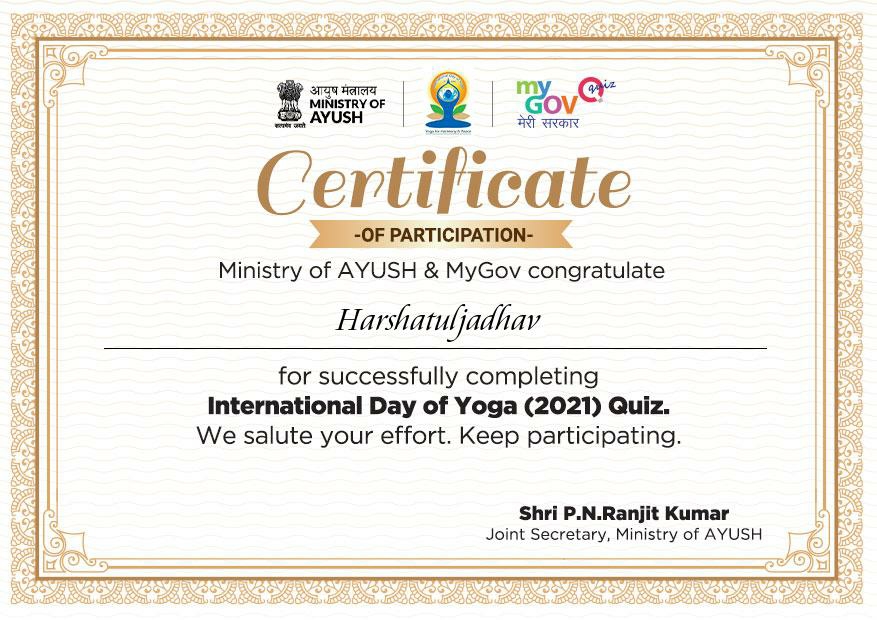 Jai Hind. I'm Cdt Sneha Tapadar from 1 GUJ AIR SQN NCC , Vadodara. I got my certificate by participating in the quiz for 7th International Yoga Day. Yoga helps in improving mental and physical strength. It should be a part of daily life.