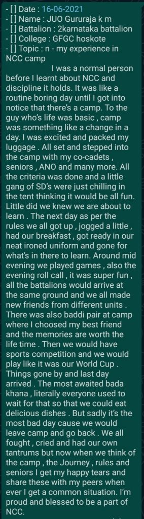 My name Gururaja k m I was written my experience in NCC camp -jai Hind