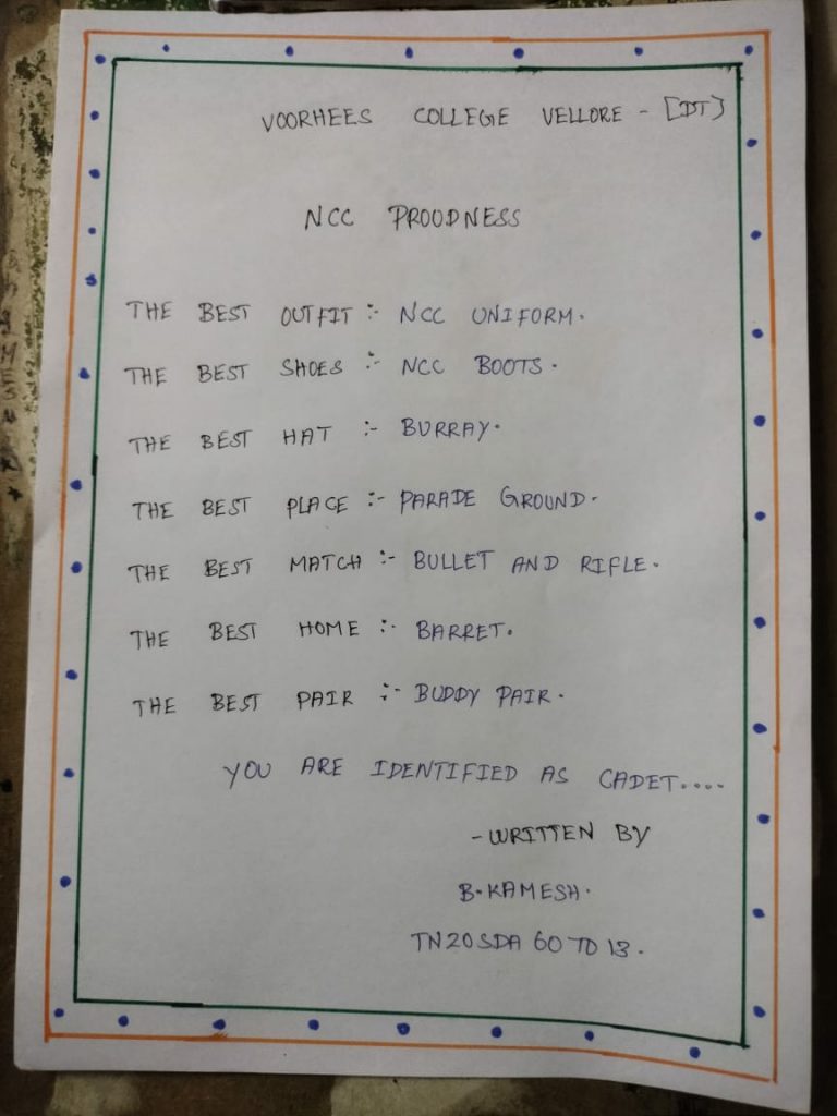 KAMESH.B, TN20SDA607013, NCC,Dte TNP&AN, 10 TN BN NCC, MADRAS A, VOORHEES COLLEGE,VELLORE.