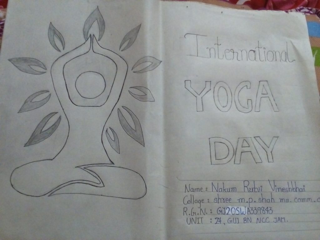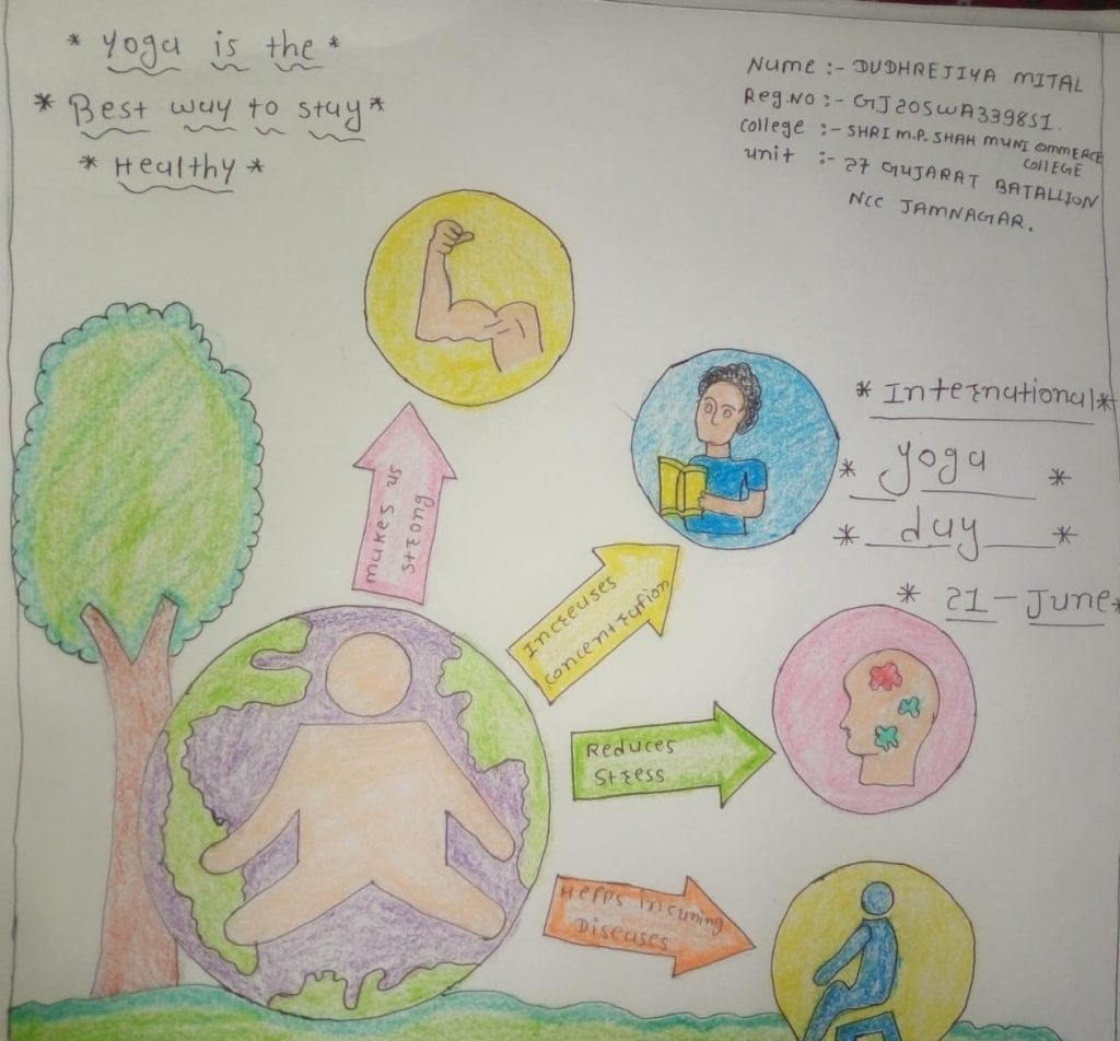 Brief.. I CDT Rutvi Nakum from MP SHAH MUNI COMM COLLEGE, 27 Gujarat BN NCC jamnagar, Gujarat Directorate sharing a poster on international yoga day.