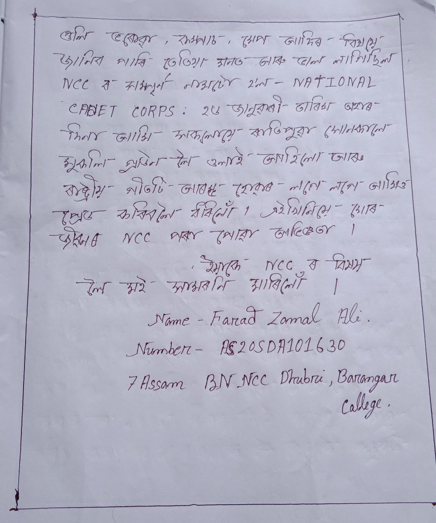 I'm cadet Farad Zamal Ali studying b.a in Barnagar college, sorbhog under 7Assam BN NCC, Dhubri