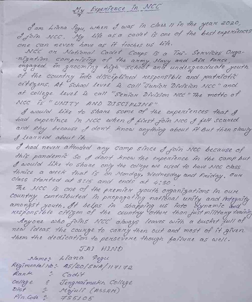 Name : Liana Pegu, Name of college : Jengraimukh College, Majuli, PIN:785105