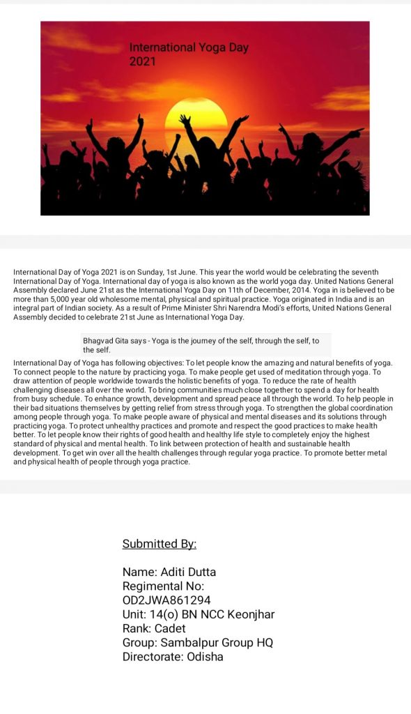 Submitted By -: Name - Aditi Dutta Regimental no.- OD20JWA861294 Unit-14(o)BN NCC Keonjhar Rank-Candet Group HQ - Sambalpur Group HQ Directorate-Odisha