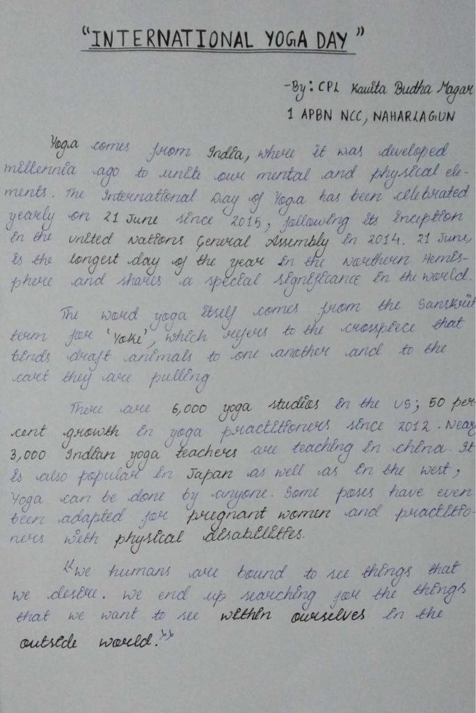 CPL KAVITA BUDHA MAGAR 1APBN NCC NAHARLAGUN NER DIRECTORATE SHILLONG TEZPUR GROUP THE INTERNATIONAL DAY OF YOGA HAS BEEN CELEBRATED YEARLY ON 21 JUNE SINCE 2015.
