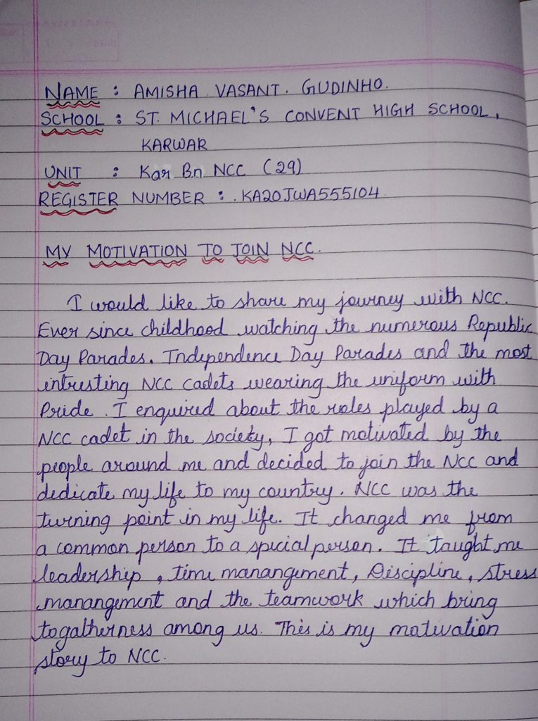 I am NCC cadet of unit Kar Bn NCC (29) Myself Amisha. Vasant. Gudinho. Studying in St. Michael Convent High School Karwar
