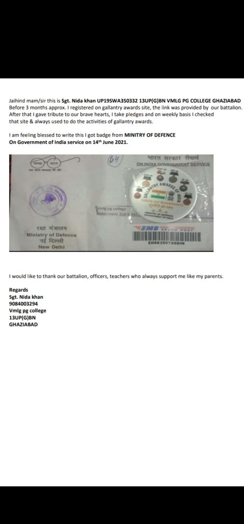CADET MANPREET KAUR CH20SWA325624 01 CHD GIRLS BN NCC CHANDIGARH P,H,HP&C DTE. CHANDIGARH GROUP (Army Wing)