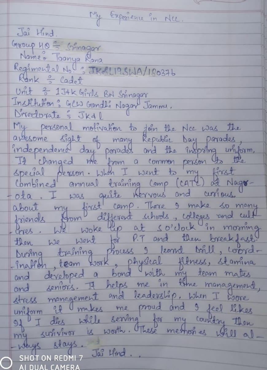 I cadet Taanya Rana from GCW Gandhi nagar jammu. Regimental no JK&L19SWA/180376. I am sharing my experience about Ncc.