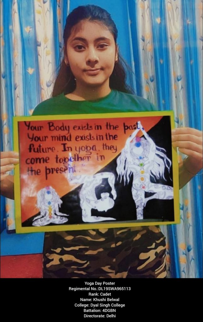 I am cadet khushi Belwal, DL19SWA965113 OF Dyal Singh College, I am here to share my experience of yoga day.The practice of yoga helps me to work through my own daily mental and physical experiences. Because yoga brings awareness to our inner bodily.