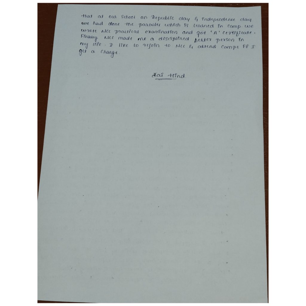 In this journey of my life, I learned leadership quality,team work,stress Management, communication skills, courage, boldness,health hygiene ,etc. I would like to convey by heartfelt thanks to my NCC mates and seniors.
