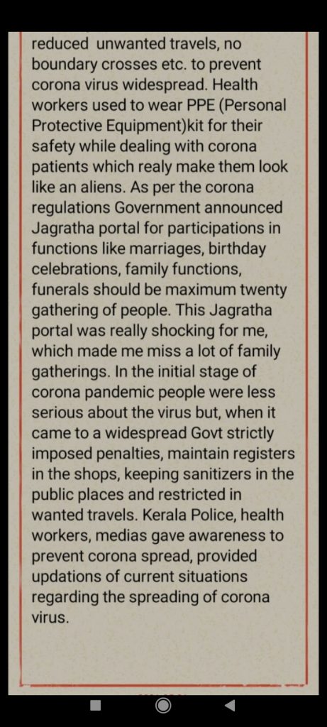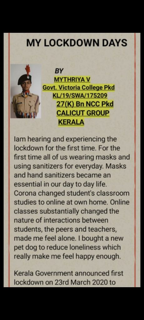 Iam Cadet Mythriya V KL/19SWA/175209. This is my article on the experiences during the lockdown days. Thank you dgncc for this great opportunity.