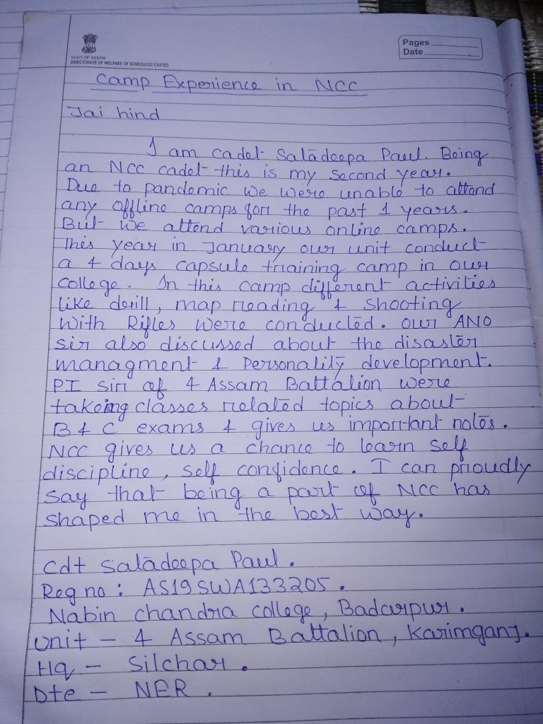 Cdt SATADEEPA PAUL Reg no: AS19SWA133205 Nabin Chandra college ,Badarpur Unit: 4Assam BN NCC, Karimganj GP HQ : Silchar Dte : NER