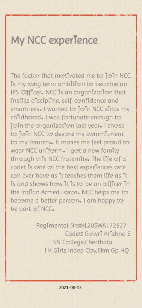 I cadet anoushka priyadarshini studying in RDWU bhubaneswar... I'm very happy that I'm a part of NCC and I learned a lot from NCC about discipline and punctuality.