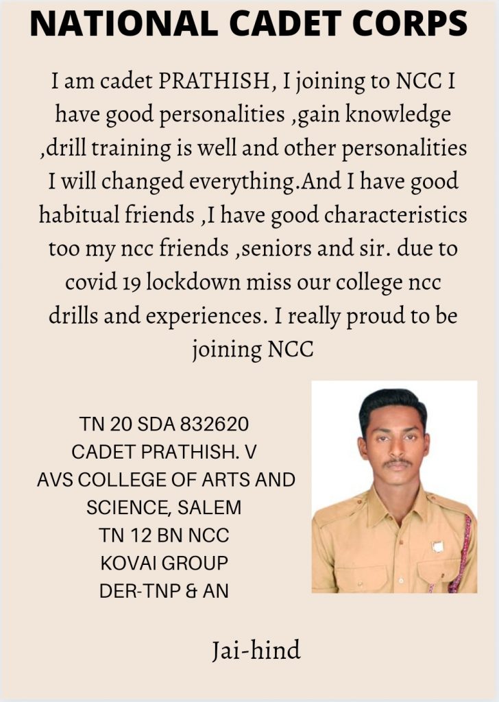 TN/20/SDA/832620 CADET PRATHISH. V AVS COLLEGE OF ARTS AND SCIENCE, SALEM 12TN BN NCC KOVAI GROUP DTE-TN P&AN