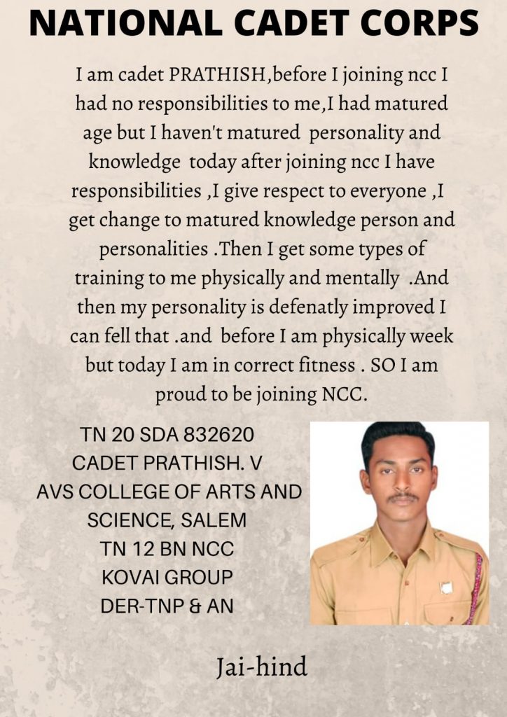 TN/20/SDA/832620 CADET PRATHISH. V AVS COLLEGE OF ARTS AND SCIENCE SALEM 12TN BN NCC KOVAI GROUP DTE-TN&AN