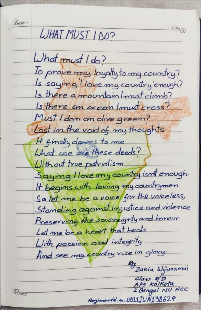 Zaria Wijunamai, class-8 'D' APS Kolkata Unit- 2 Bengal NU NCC Regimental no.- WB21JWN138624 rank- junior wing