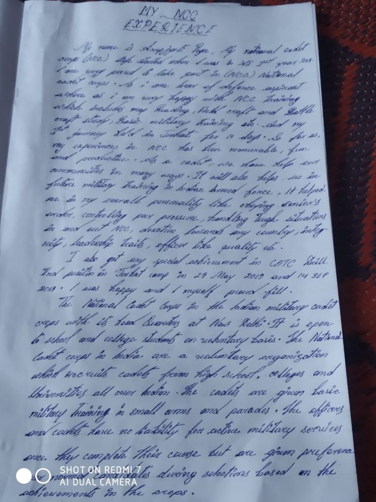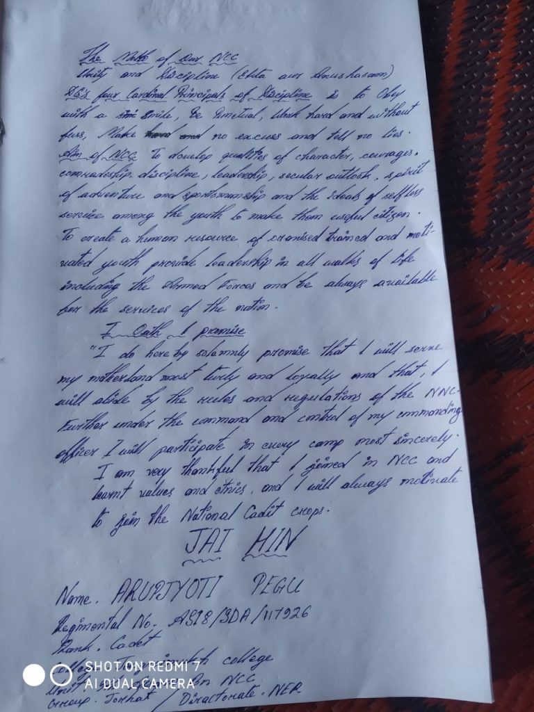 ARUPJYOTI PEGU Regimental No: AS18/SDA/117926 Unit: 9th Assam Bn NCC Group: Jorhat Diractorate: NER College: Jengraimukh college