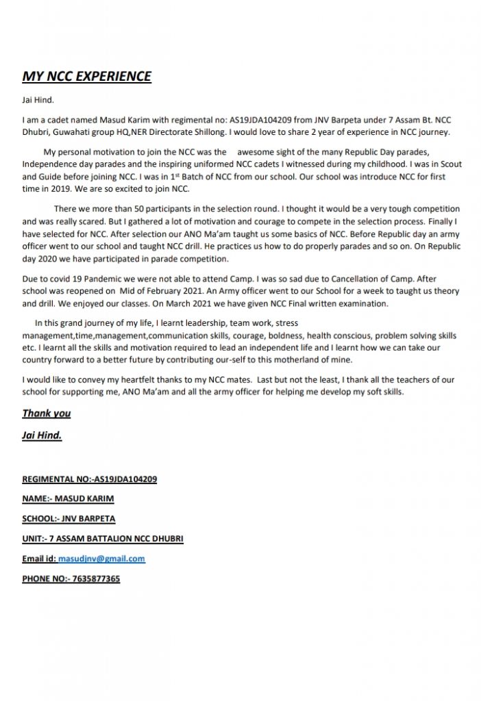 I am a cadet name Masud Karim from JNV BARPETA under 7 ASSAM BATTALION. Recently, I have given exam for A certificate.