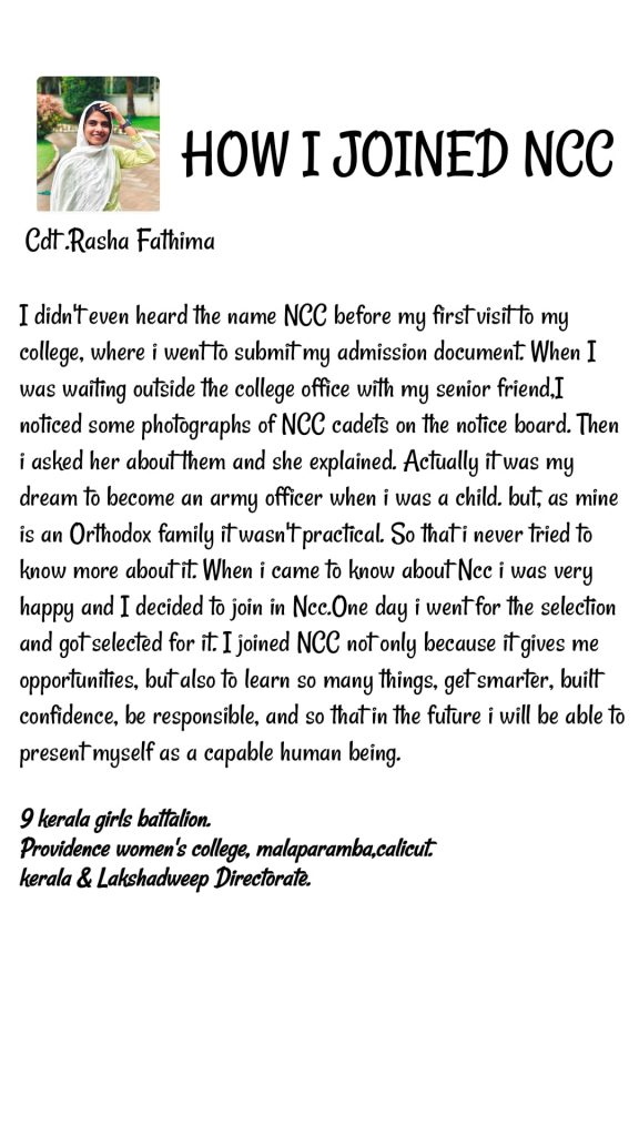 I'm a second year NCC cadet from providence womens college, malapparamba, calicut. I have done an article on my experience about How i joined in NCC.